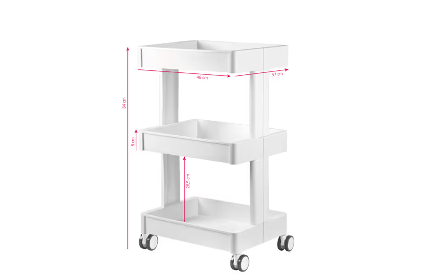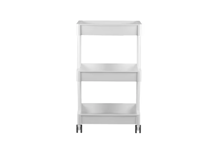 La resistente struttura in plastica è dotata di tre ripiani con bordo alto per evitare che il contenuto fuoriesca. Le ruote piroettanti facilitano lo spostamento dell'unità in qualsiasi direzione, anche negli spazi più ristretti. L'elegante colore bianco si adatta a diversi spazi e interni.