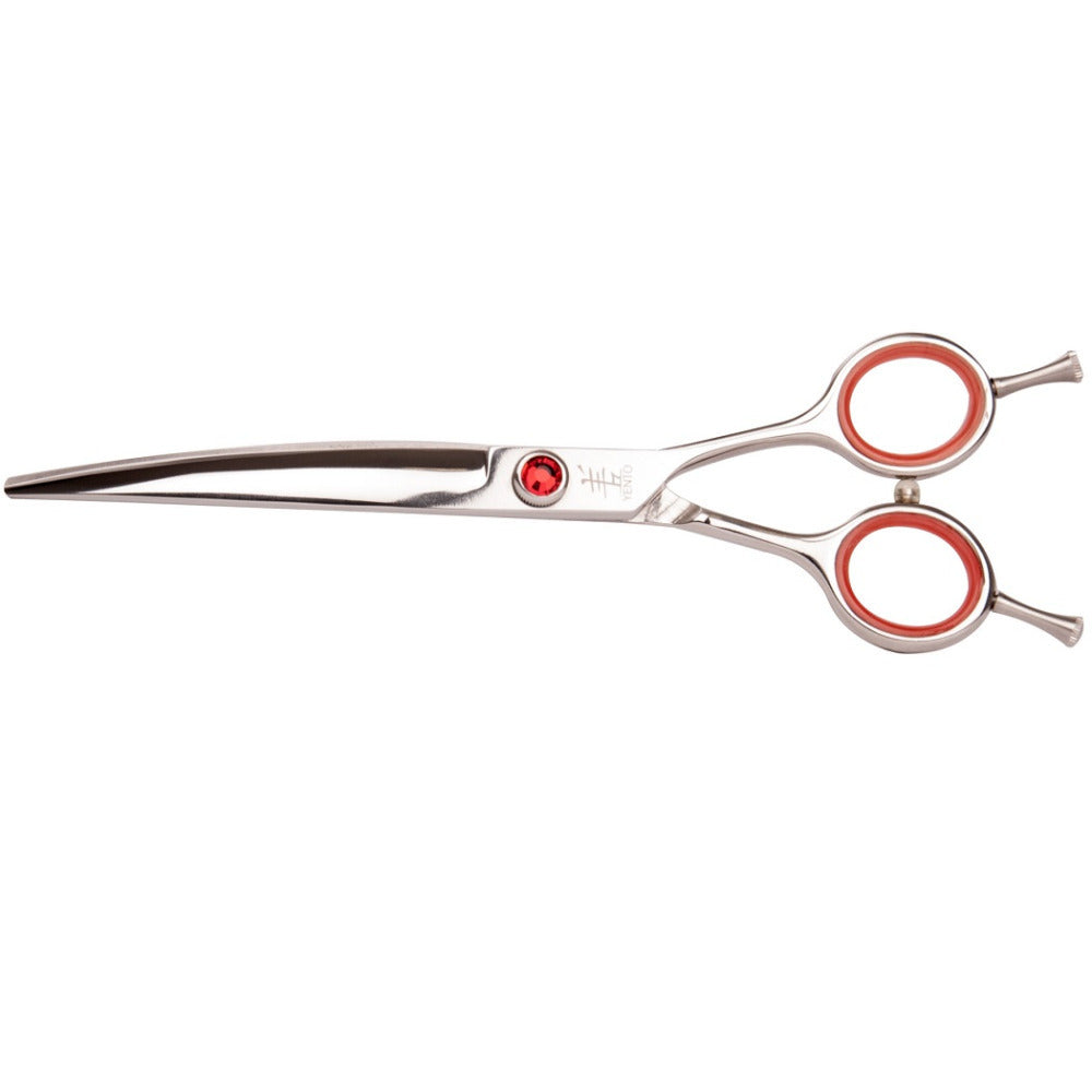 Forbici professionali curve di Yento, modello Prime , progettate per destrimani . Realizzate in acciaio giapponese 440C di altissima qualità, lucidate a specchio. Ideali per la rifinitura circolare, come muso, zampe o coda, garantiscono un taglio perfettamente affilato su tutti i tipi di pelo e sono particolarmente consigliate ai professionisti. Lavorare con queste forbici è un vero piacere; sono ben bilanciate e hanno un'impugnatura ergonomica . Sono dotate di un gancio e di un'elegante vite di fissaggio con diamante rosso. Sono fornite in una pratica custodia con un panno di camoscio.