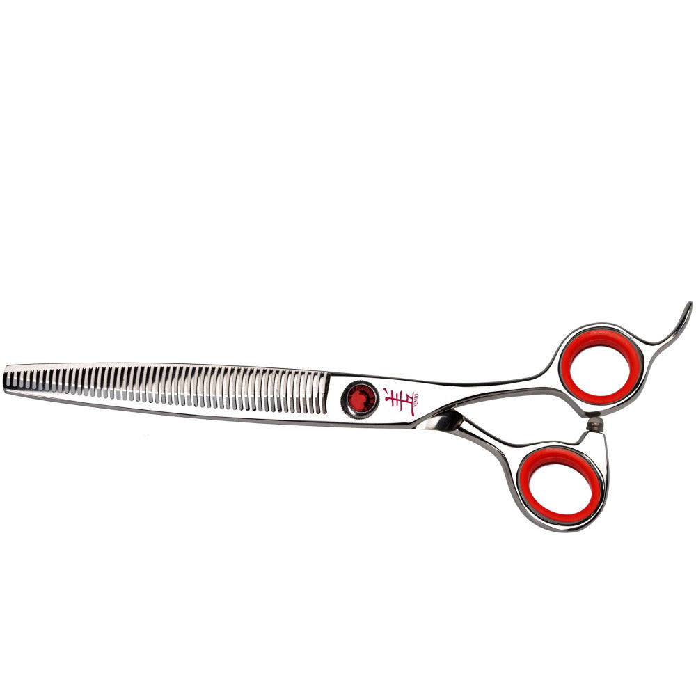 Forbici professionali per sfoltire monolaterali Yento, modello Prime. Realizzate in acciaio giapponese 440C di altissima qualità, i denti sono progettati per impedire ai capelli di scivolare durante lo sfoltimento su tutti i tipi di capelli. Consigliate soprattutto ai professionisti. Lavorare con questo strumento è un vero piacere, ben bilanciato e con un'impugnatura ergonomica. Presenta un gancio e un'elegante vite di pressione a forma di diamante rosso. Viene fornito in una pratica custodia con un panno in pelle scamosciata.