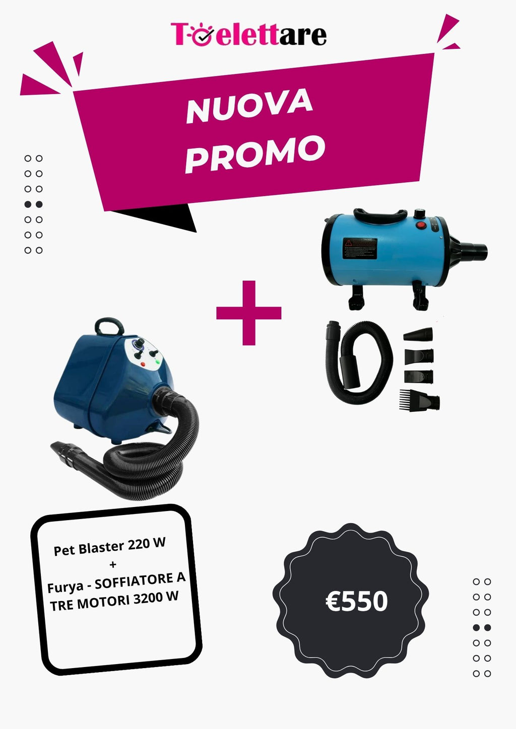 Ecco il duo di soffiatori definitivo per affrontare ogni sfida in toelettatura! Questa promozione combina la forza esplosiva del FURYA 3 motori con la praticità del Pet Blaster 2200W, garantendo velocità e versatilità.