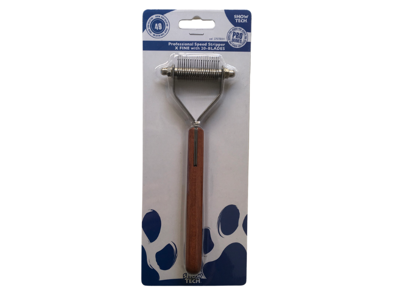 Questo tagliacapelli a uncino con comoda impugnatura in legno di Show Tech è dotato di 20 denti distanziati di 1,5 mm. È ideale per cani a pelo lungo e razze a pelo duro. Consigliato per razze come Schnauzer, Terrier russi, Spaniel, Setter, West Highland White Terrier, Chevalier King Charles Spaniel e Golden Retriever.